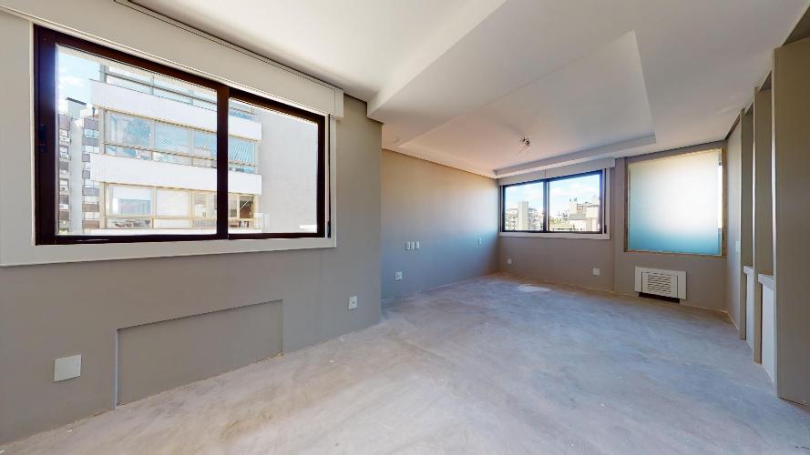 Ampla sala com sacada e vista para a Praça da Encol, iluminada pelo sol da manhã.